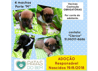 28/09/2018 VIC - Fêmea. Raça: SRD. Idade: 4 meses. Porte: Médio. Cidade: Canoas/RS. Foi resgatada da rua com mais quatro irmãos recém nascidos. Tratamos, cuidamos e agora precisamos muito doar. Estamos com ela e mais dois irmãozinhos para doação. Contatos: (51) 99756.9830 com Renan e 99159.5177 com César.