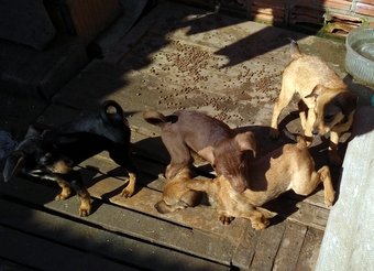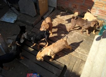 21/08/2018 CÃEZINHOS ÓRFÃOS PARA ADOÇÃO (POA/RS) - Esses são os cãezinhos órfãos de uns oitenta dias. As marrons e uma amarela são as fêmeas, além deles tem quatro adultos, desses, as duas cadelas já castrei, a Mãe dos filhotes morreu logo após o parto, a tutora não sabe o motivo, era de porte médio, o Pai, um pouco maior, provavelmente tb serão médios. Tenho os tratado diariamente, porém uma única vez, estão em um local com pouco espaço, que as vezes alaga, emagrecendo rápido e ficando agressivos entre eles na hora de comer, precisam com urgência encontrar um Novo Lar e as fêmeas já serem castradas daqui uns trinta dias, senão irão procriar entre eles.